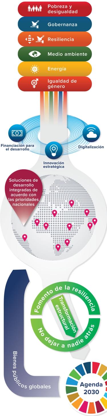 El Plan describe la manera en que la combinación de nuestra vasta experiencia local y extensa red mundial, que se nutre del conocimiento y la experiencia compartida de los países, aporta valor a los socios. Asimismo, detalla cómo vamos a fomentar la innovación y la creatividad para ayudar a cambiar los sistemas y hacer frente a los mayores desafíos que nos aguardan en el camino hacia la consecución de los ODS. Todas estas medidas tienen por objeto intensificar y acelerar el progreso hacia transiciones ecológicas e inclusivas que empoderen a todas las personas a través de mayores oportunidades y resiliencia.